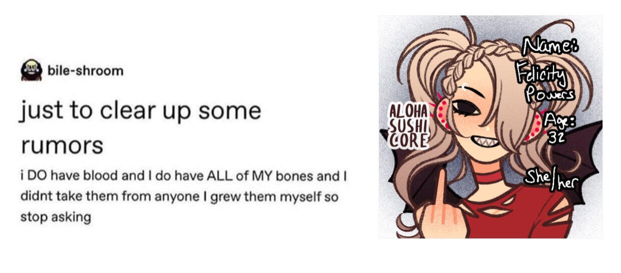 A rather intense person to interact with, Felicity loves to live her way. Unafraid to speak her mind, and with a potty-mouth to boot, she typically gets called a mean girl. Though abrasive, she is fiercely loyal and protective of those she hold dear, and is often the first to go to bat over any injustice. Once you've gained her respect, she is a formidable ally. A member of the belito.